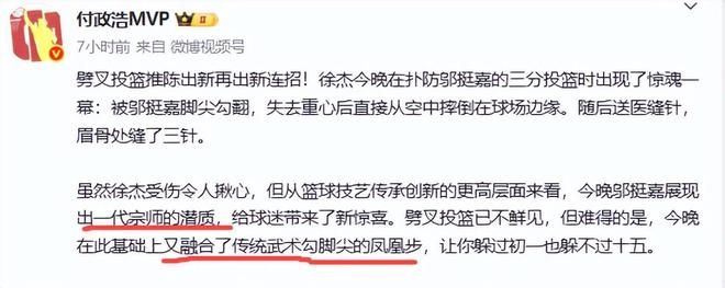 我們的聯(lián)賽培養(yǎng)不出國(guó)際球星,卻繁生了一批劈腿將士,最有名的是外援弗格,國(guó)內(nèi)的趙繼偉發(fā)揚(yáng)光大,張寧也不賴,緊跟趙繼偉,如今又出現(xiàn)了一個(gè)鄔挺嘉。而鄔挺嘉在劈腿的基礎(chǔ)上還有創(chuàng)新。媒體人付政浩指出,“鄔挺嘉展現(xiàn)出一代宗師的潛質(zhì),給球迷帶來了新驚喜。劈叉投籃已不鮮見,但難得的是,今晚在此基礎(chǔ)上又融合了傳統(tǒng)武術(shù)勾腳尖的鳳凰步,讓你躲過初一也躲不過十五。”付政浩界定鄔挺嘉的劈腿動(dòng)作是“武術(shù)勾腳尖的鳳凰步”。他嘆道,本應(yīng)該判違體犯規(guī),但是段鑄“裁判根本沒有意識(shí)到腳尖發(fā)力這一下的玄妙之處?!?/p>