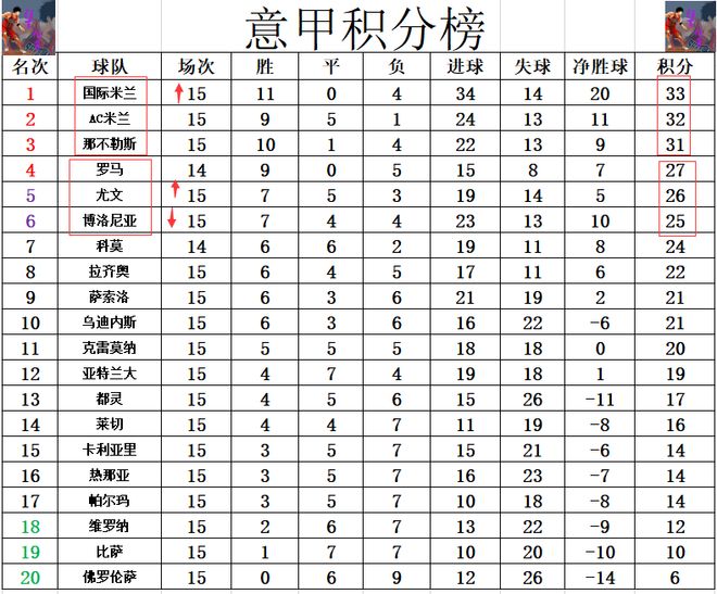 積分榜方面,AC米蘭和那不勒斯齊齊掉鏈子,一個打平一個輸球,國米把握住機會客場小勝,這樣的話國米就超過那不勒斯2分,超AC米蘭1分奪回榜首。爭4方面,尤文關(guān)鍵對話中擊敗博洛尼亞,超過后者升至第5,暫時只少第4的羅馬1分。