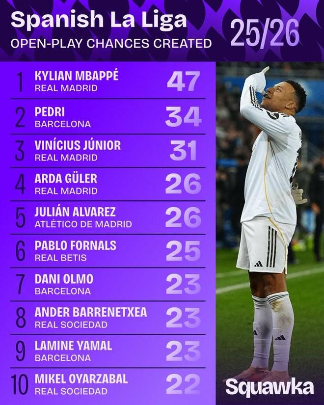 根據(jù)統(tǒng)計(jì),本賽季到目前為止,姆巴佩是西甲當(dāng)中運(yùn)動戰(zhàn)創(chuàng)造機(jī)會最多的球員,佩德里位居第二,維尼修斯位居第三。